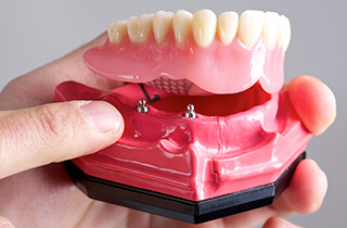 For more extensive tooth loss, patients will need four to six dental implant posts to support a partial or full denture. Like their traditional, removable counterparts, implant-supported prosthetics are crafted using a gum-colored base to support any number of replacement teeth. We use the minimum number of implants possible to achieve adequate support.